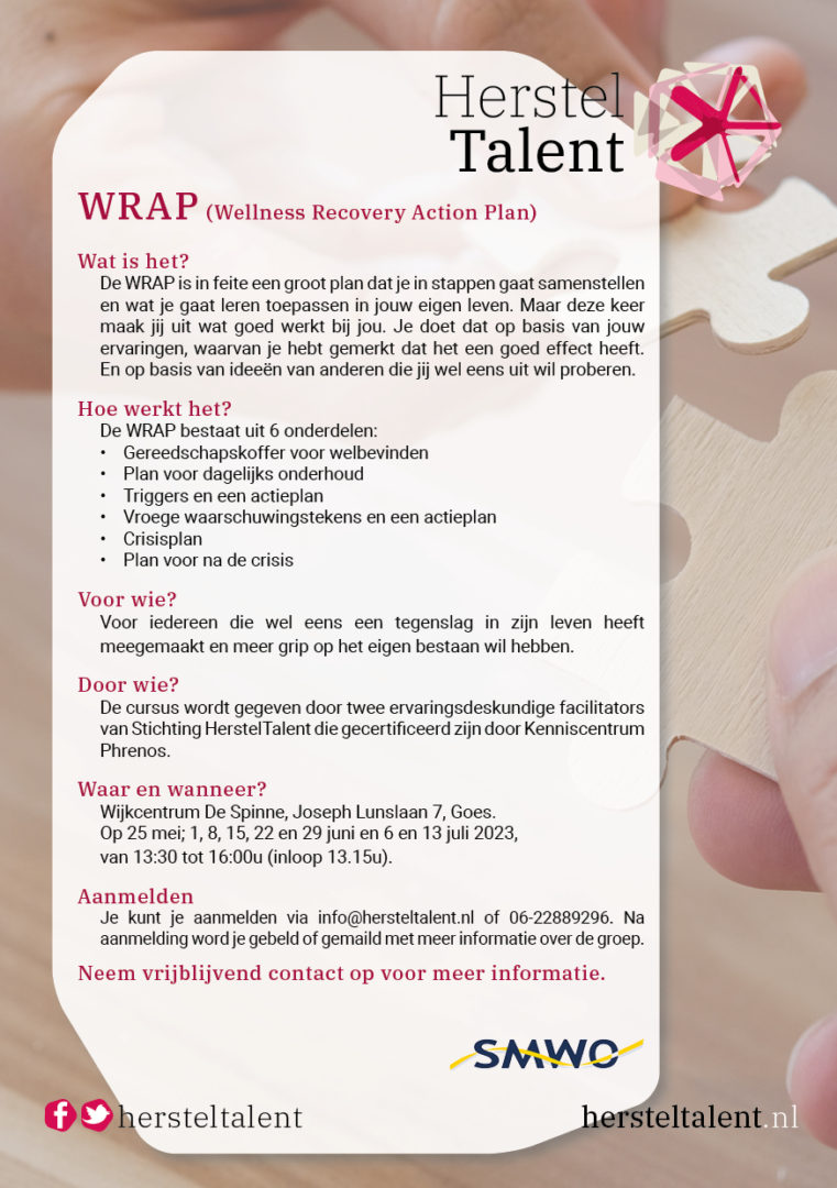 Op 25 mei 2023 start er een WRAP in Goes in wijkgebouw de Spinne. Voor meer informatie over de WRAP zie de onderstaande flyer.