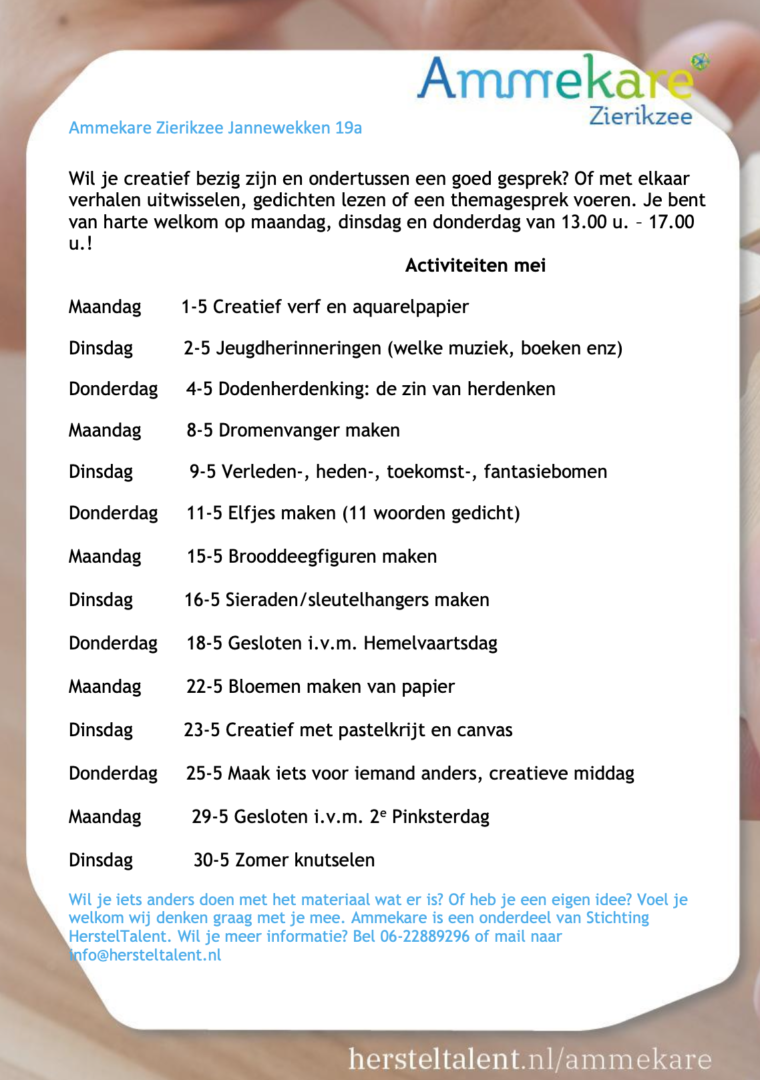 Ook in mei ben je van harte welkom bij Ammekare Zierikzee. Hieronder zie je wat er te doen is. Daarnaast kun je ook zelf iets doen of gewoon een praatje maken.